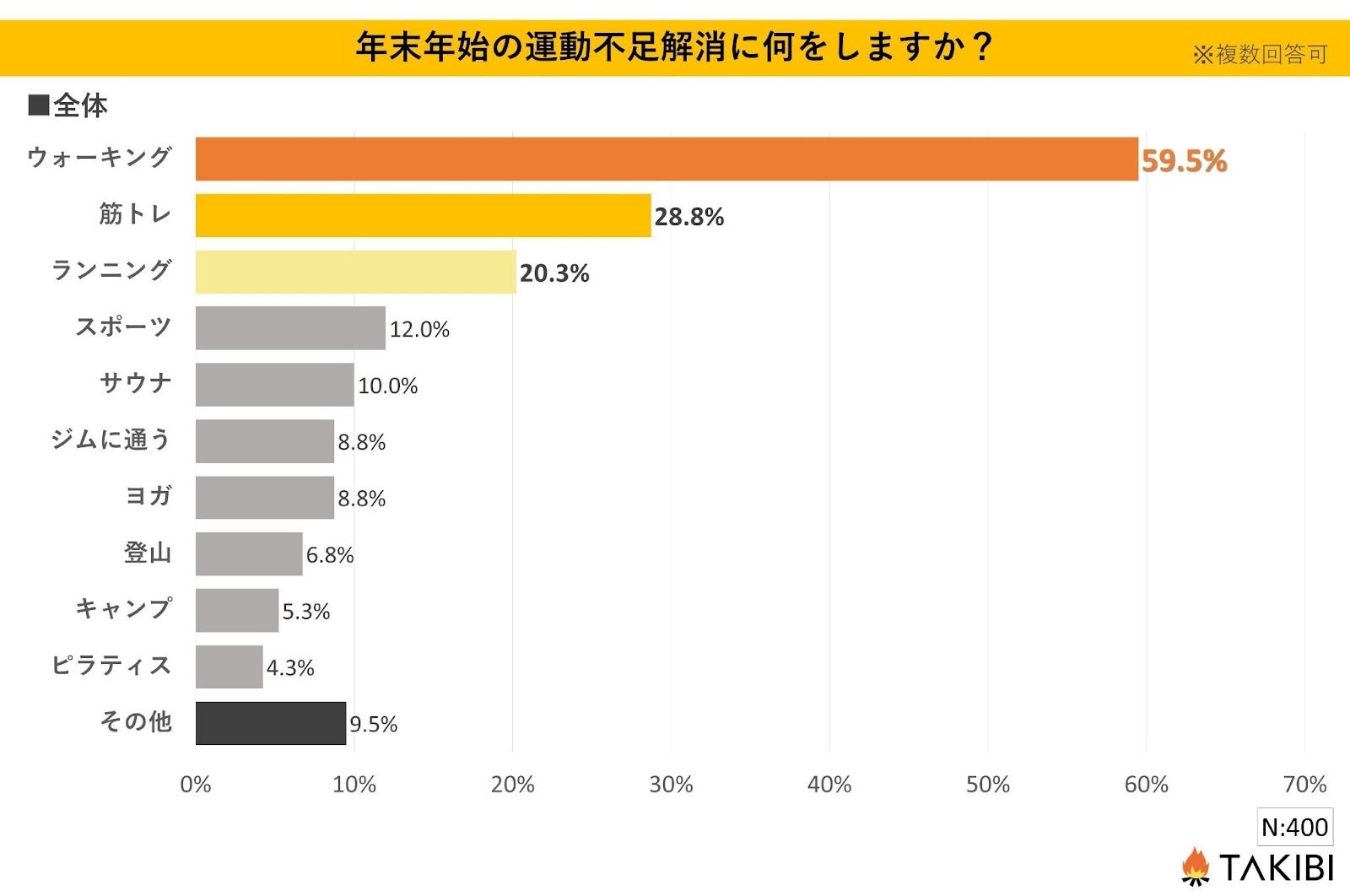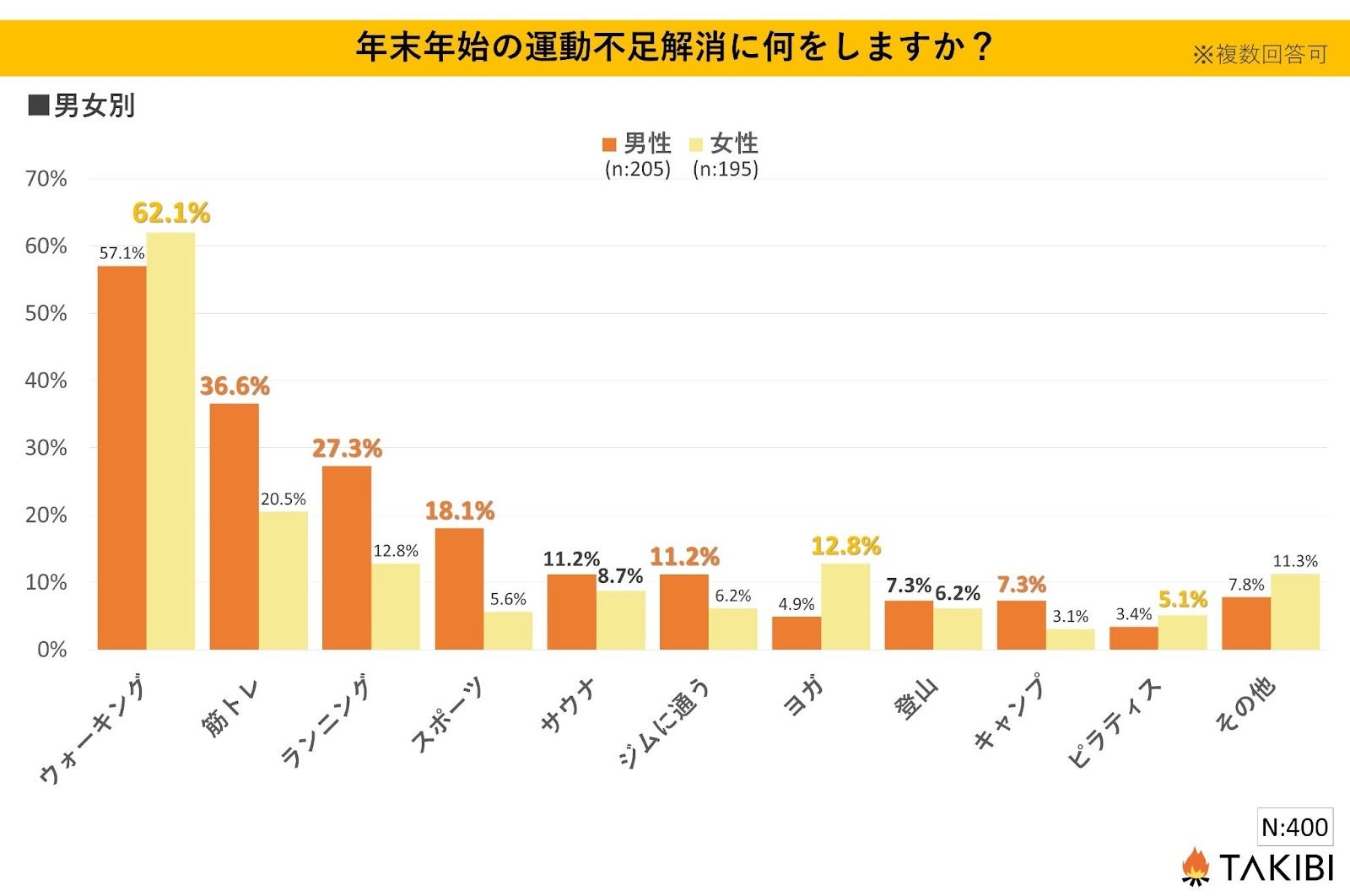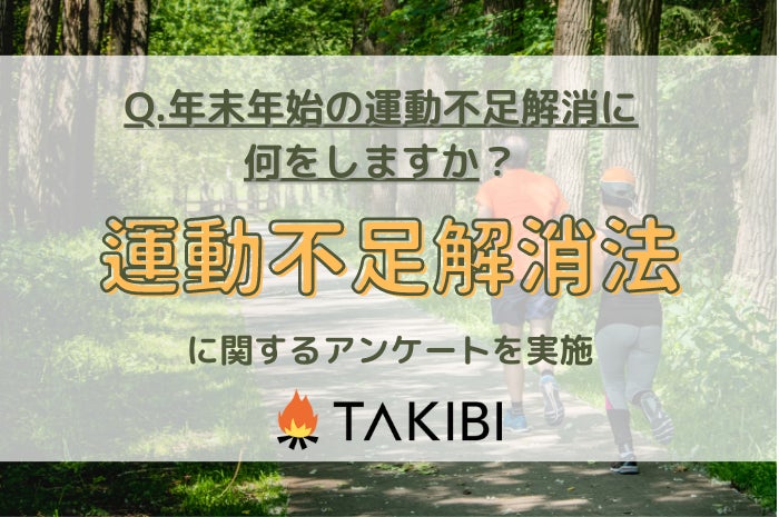 キャンプやグランピングを中心としたアウトドア総合情報サイト「TAKIBI」の運営をおこなう株式会社フォーイットは、全国の10代~60代までの男女400人を対象に年末年始の運動不足解消方法に関するアンケートを実施し、男女別・年代別等の特徴についてまとめました。