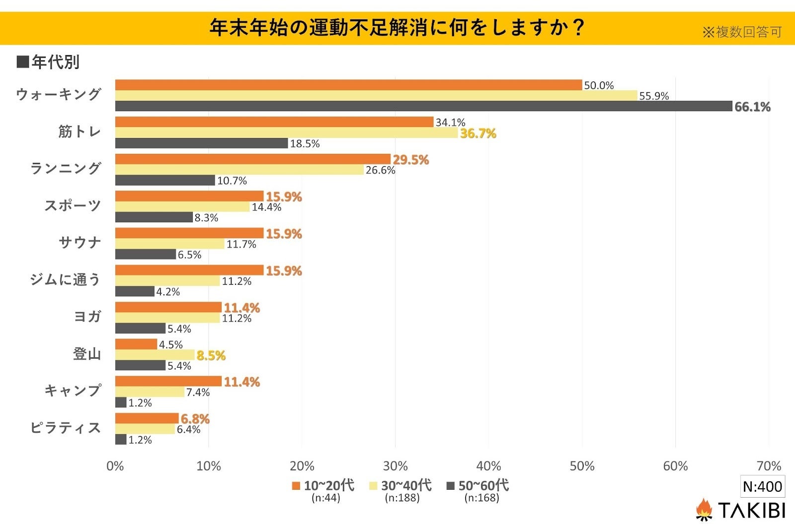 年代別に見ると、最も票が集まった項目として、50〜60代の「ウォーキング」となり、約7割の方が回答する結果となりました。