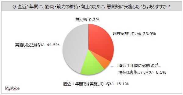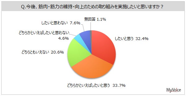 | https://myel.myvoice.jp/products/detail.php?product_id=29509 ※上記設問の他に、筋肉・筋力の維持・向上のために「実施したこと」「取り組みを行いたい理由」 も聞いています。 |
