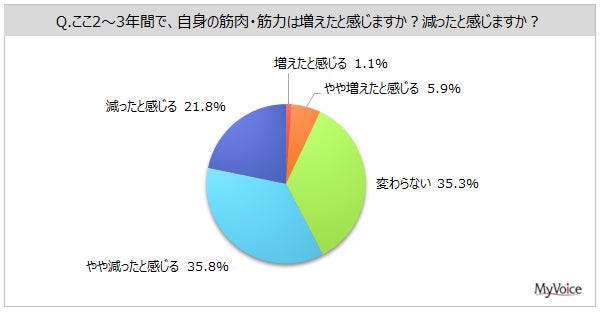 ■ここ2~3年間で自分の筋肉・筋力が減ったと感じる人は6割弱、「変わらない」が約35%。直近1年間に、筋肉・筋力の維持・向上のために実施したことがある人は4割弱
